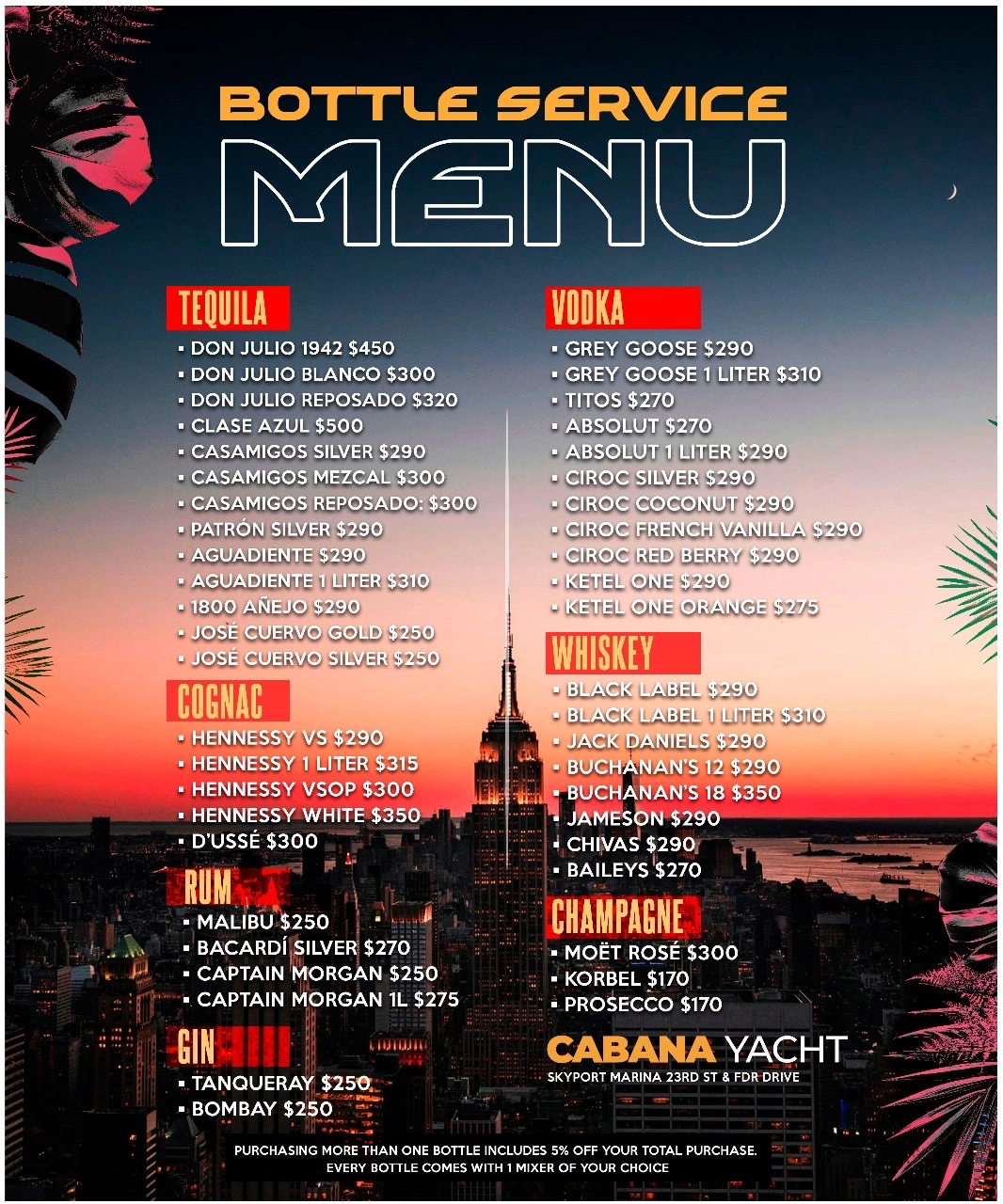 ???? Location: Cabana Yacht – Skyport Marina, 2430 FDR Drive, NYC