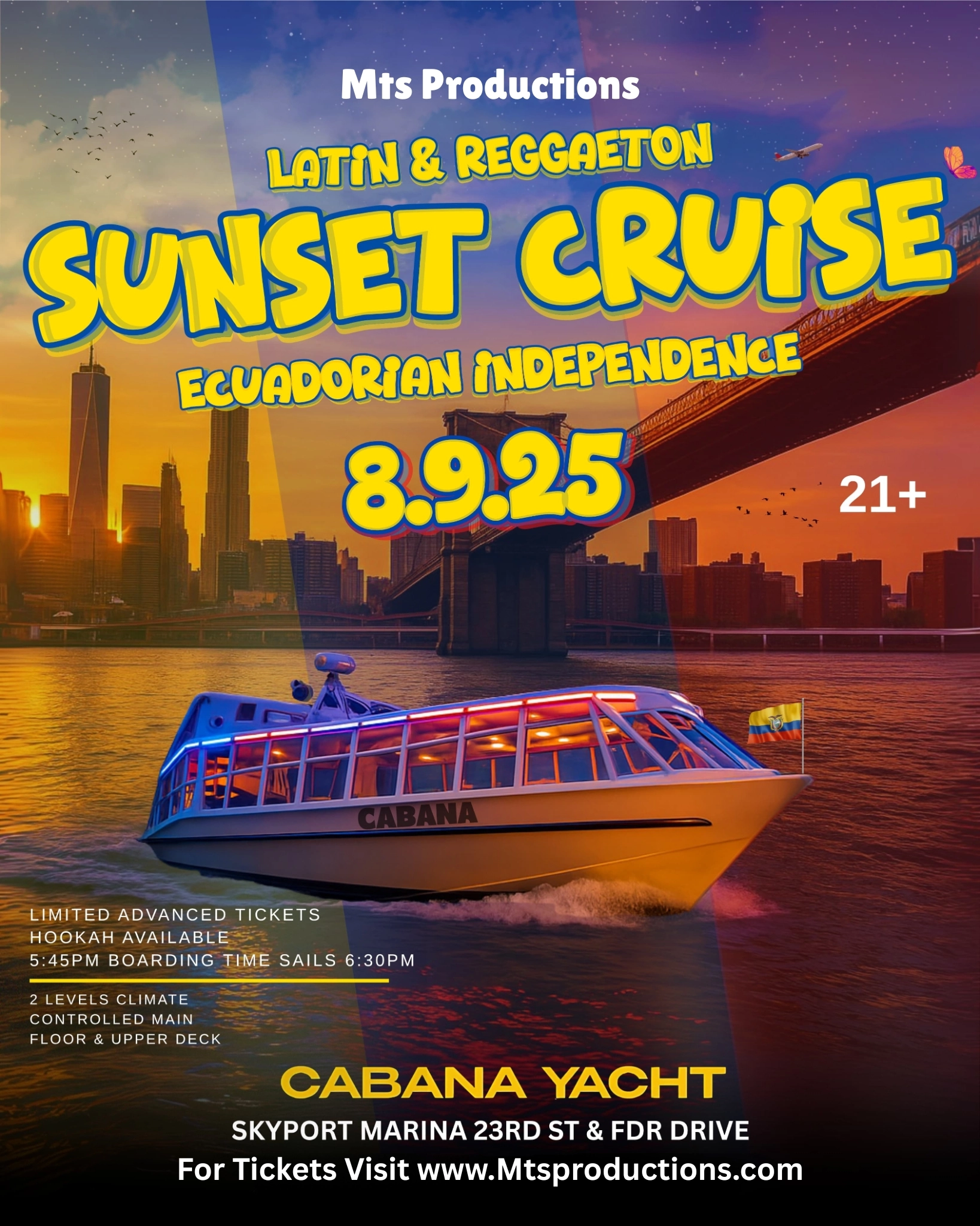 Celebrate Ecuadorian Independence Day in unforgettable style on Saturday, August 9th, aboard the luxurious Cabana Yacht with MTS Productions! This Latin & Reggaeton Sunset Cruise in NYC is set to deliver non-stop music, dancing, and skyline views like no other. Follow us on Instagram and Facebook for upcoming events & free giveaways.