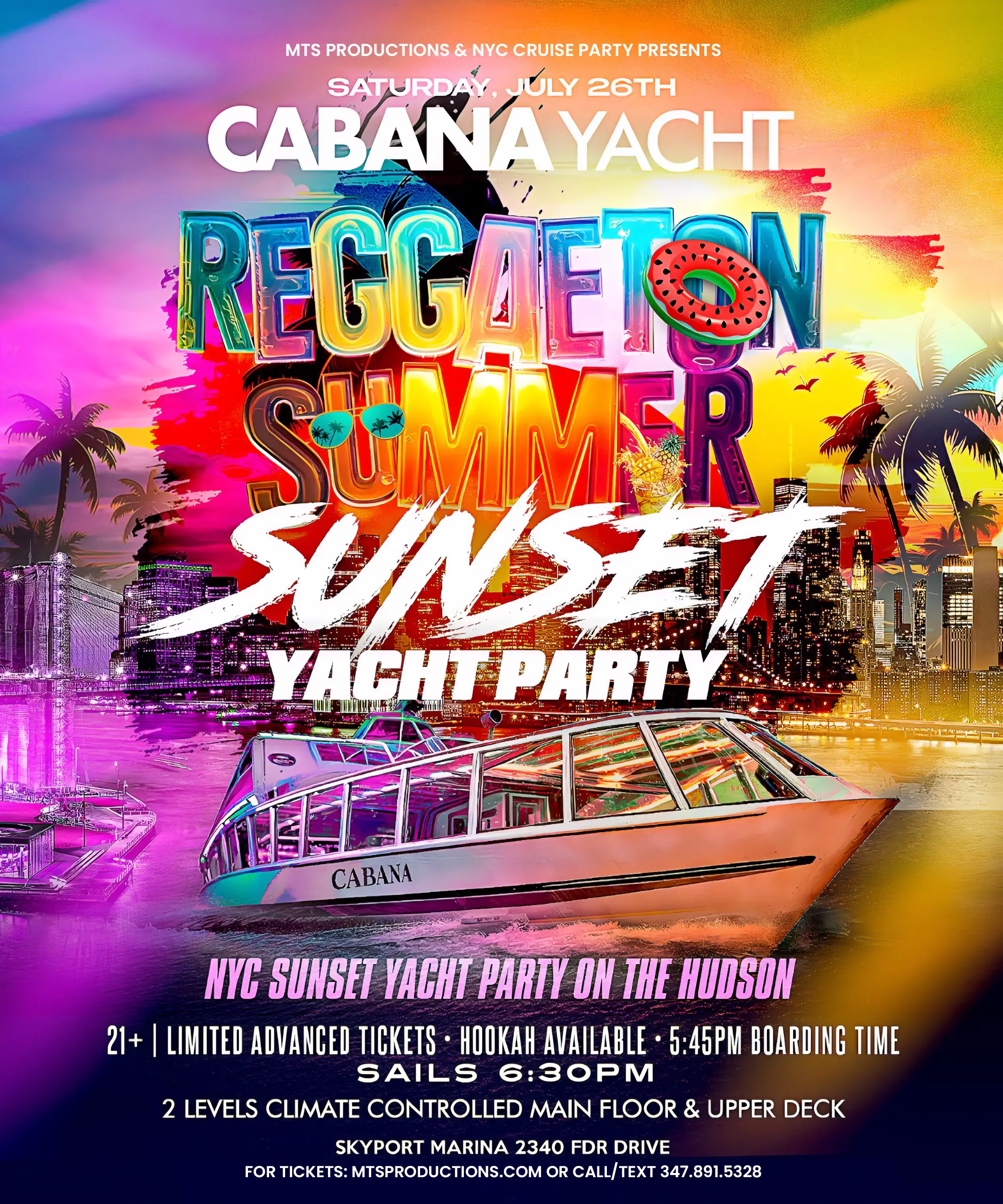 NYC, get ready! On Saturday, July 26th, MTS Productions invites you to the ultimate Latin & Reggaeton Summer Sunset Yacht Party aboard the luxurious Cabana Yacht.