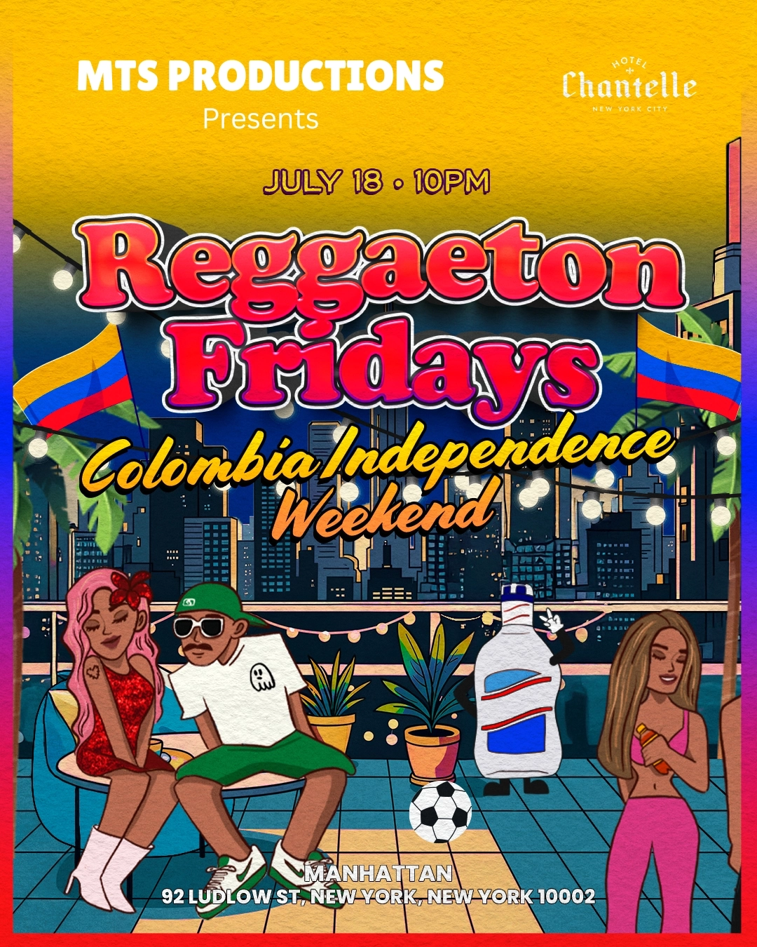 Celebrate Colombian Independence Day in true NYC style — on the rooftop at Hotel Chantelle with Reggaeton Fridays, the ultimate Latin party experience in the city! This special edition is all about Colombia, with DJs spinning the best Reggaeton, Latin, Salsa, Dembow, Champeta, Vallenato, and Crossover hits all night long. Follow us on Instagram or Facebook for upcoming events and free giveaways.