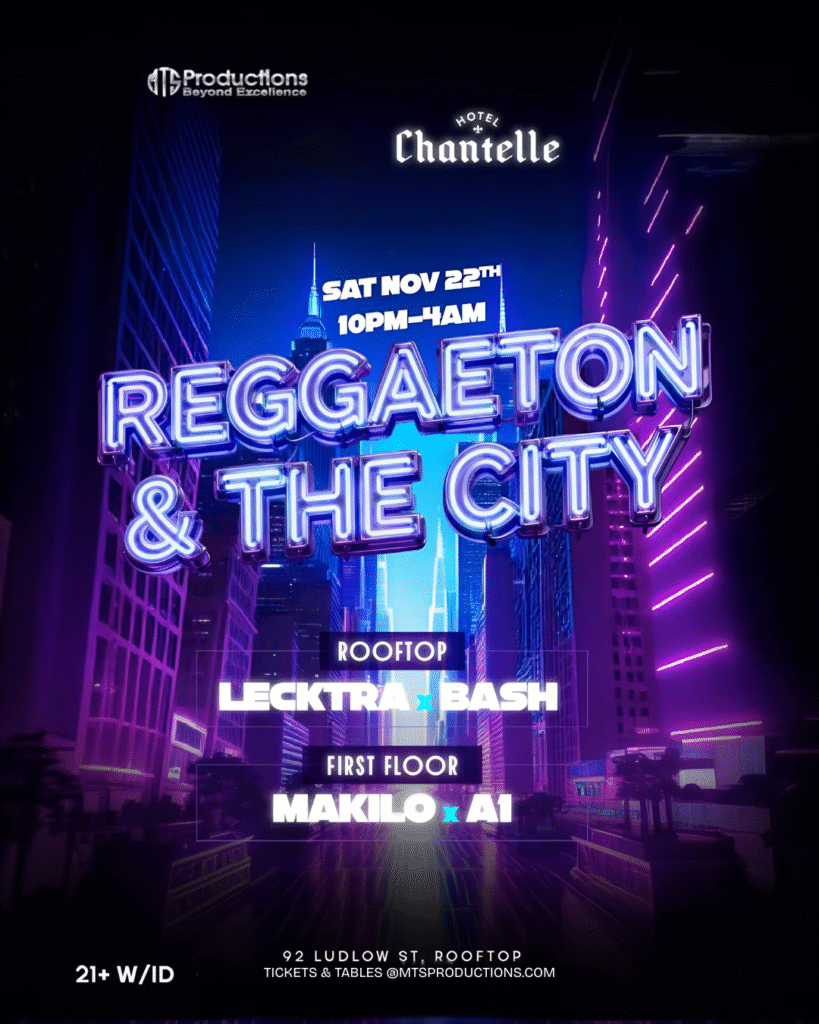 🔥 Don’t miss Reggaeton in the City — the ultimate Latin rooftop party happening Saturday, November 22nd at Hotel Chantelle NYC. Dance, connect, and celebrate Latin music at its finest with MTS Productions. Grab your tickets or table now before it’s sold out!