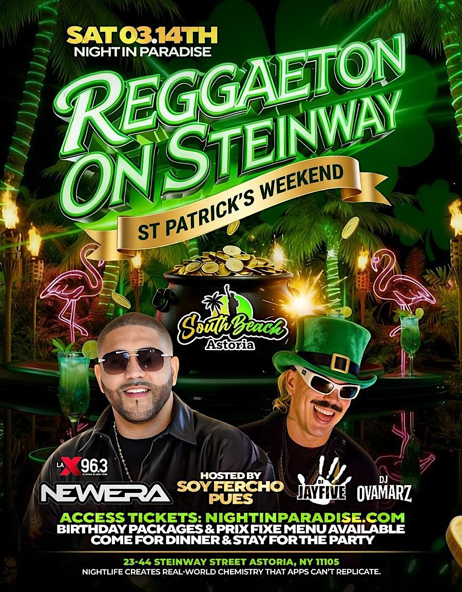 Celebrate St. Patrick’s Weekend in Astoria with one of the most exciting Latin nightlife events in Queens — Reggaeton on Steinway, part of the Night in Paradise experience at South Beach Astoria.