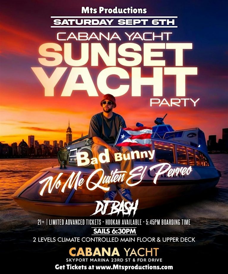Celebrate Bad Bunny Night in NYC on Saturday, September 6th aboard the Cabana Yacht! Dance to Bad Bunny hits and Reggaeton with NYC Top Djs ???? Bad Bunny Night – No Me Quiten El Perreo Sunset Yacht Party NYC New…