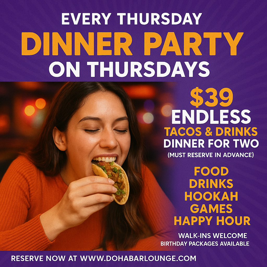 The Long Island City Best Party Spot Thursday at Doha Bar Lounge is the premier Thursday night event in Long Island City. With endless tacos and drinks for $39 for two, live DJs, hookah, games, and a lively happy hour, it caters to all. Whether celebrating a birthday or seeking fun, this spot shines. Reserve at www.dohabarlounge.com for an unforgettable Long Island City Best Party Spot Thursday!
