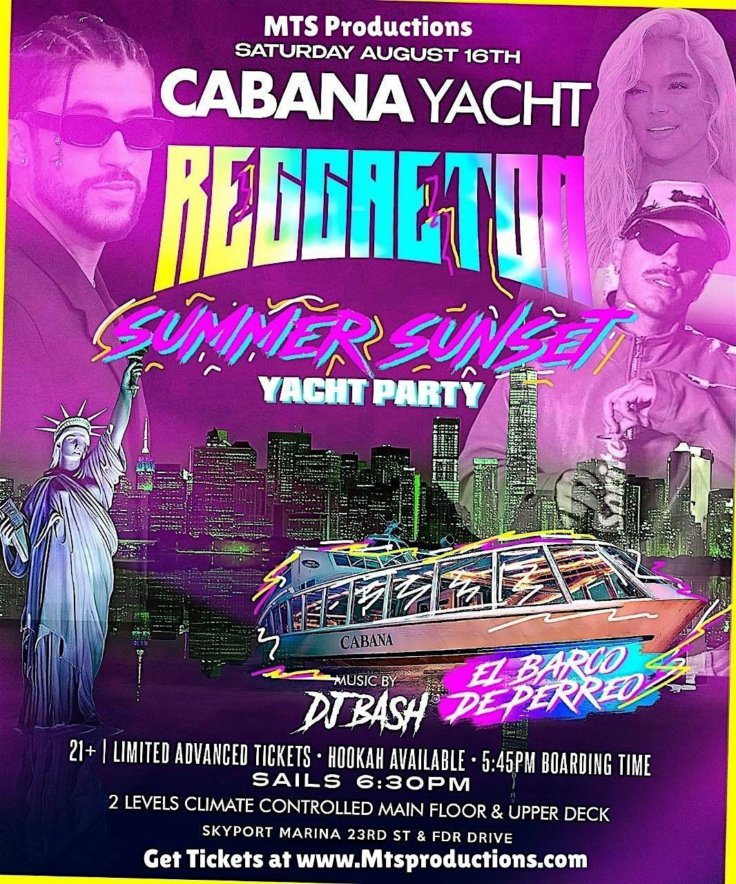 Looking for an unforgettable party cruise in NYC? Cabana Yacht NYC is the best place to enjoy the sunset in Manhattan, offering an exclusive Latin Vibe Sunset Yacht Party with breathtaking city views, top-tier entertainment, and a lively atmosphere. Departing from Skyport Marina, 2430 FDR Drive Service Rd E, New York, NY 10016, this yacht party promises a one-of-a-kind nightlife experience. Whether you’re celebrating a birthday, graduation, or special event, Cabana Yacht Parties are the perfect way to enjoy an evening on the water. Follow us on TikTok or Instagram for upcoming events or free giveaways.